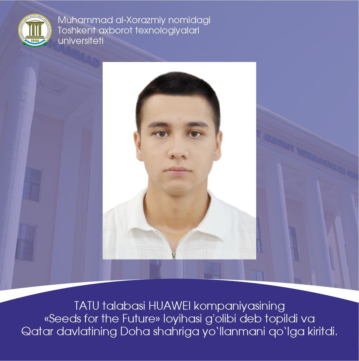 Muhammad al-Xorazmiy nomidagi Toshkent axborot texnologiyalari universitetining Kiberxavfsizlik fakulteti 3-bosqich talabasi Bobur Jo‘rabekov HUAWEI kompaniyasining «Seeds for the Future» loyihasi g’olibi deb topildi va Qatar davlatining Doha shahriga yo‘llanmani qo‘lga kiritdi. “Seed for the Future” loyihasining birinchi bosqich g‘oliblari Huawei kompaniyasining Yaqin Sharq va Markaziy Osiyo, xususan Qatar va BAAdagi mintaqaviy ofisi tomonidan tashkillashtirilgan Qatar...Read More